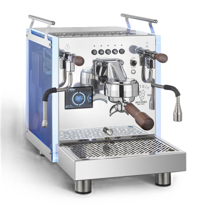 Bezzera Matrix Top, Dualboiler Siebträger-EspressomaschineDie MATRIX ist eine Neuheit in der Welt der halbautomatischen Espressomaschinen. Sie kombiniert die elektrisch beheitze Bezzera Brühgruppe mit einer ausgefeilten Software und Elektronik, welche über ein 3,5 "-Touch-Display die Programmierung des Dualboiler-Systems gesteuert wird. Mit verschieden farbigen Seitenteilen aus Plexiglas kann man die Maschine im Handumdrehen dem Einrichtungsstil des Raumes anpassen.