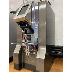 Selbstverständlich kann man mit dieser Mühle den Mahlgrad stufenlos verstellen, eine Universal-Haltevorrichtung für den Siebträger damit man „Hands-Free mahlen kann sowie die Wahl der Dosierungsmöglichkeit. Das heisst, die Dosierung kann man entweder manuell vornehmen oder über einen Timer programmieren. Desweiteren bietet diese Mühle einen kontinuierlichen Bezug. Man kann also den Bezug unterbrechen, auf der digital-Anzeige wir die aktuelle Sekundenzahl angezeigt. Drückt man wieder auf den Bezugsknopf um mit dem Mahlen fortzufahren, mahlt die Mühle automatisch die restliche Zeit fertig. Über die digitale Anzeige lässt sich jegliche Programmierung simpel via Touch Screen vornehmen.