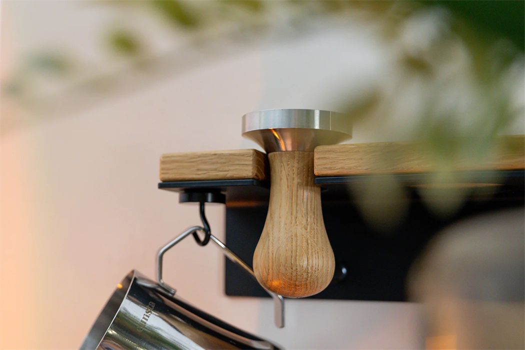Damit dein Setup im Alltag zuverlässig und komfortabel funktioniert, haben wir alle Maße sorgfältig aufeinander abgestimmt. Die Abstände zwischen den Siebträgern betragen 15 cm (Mitte zu Mitte) und ermöglichen einen schnellen, einfachen Zugriff auch dann, wenn es an der Maschine mal zügig gehen muss. Unterhalb des Platzes für den Tamper haben wir zusätzlich Raum gelassen, um das Blindsieb direkt am gleichen Ort aufzubewahren so bleibt alles ordentlich und griffbereit. Außerdem liefern wir praktische Magnethaken mit, mit denen du das Regal flexibel erweitern kannst ideal für Baristatuch, Pinsel oder andere Tools, die du griffbereit aufhängen möchtest. Selbstverständlich ist auch alles benötigte Zubehör für den Aufbau im Lieferumfang enthalten, sodass du sofort starten kannst.