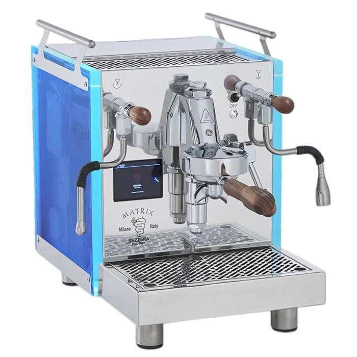 Bezzera Matrix Top, Dualboiler Siebträger-EspressomaschineDie MATRIX ist eine Neuheit in der Welt der halbautomatischen Espressomaschinen.Sie kombiniert die traditionelle E61-Technik mit einer ausgefeilten Software und Elektronik, welche über ein 3,5 "-Touch-Display die Programmierung des Dualboiler-Systems gesteuert wird.