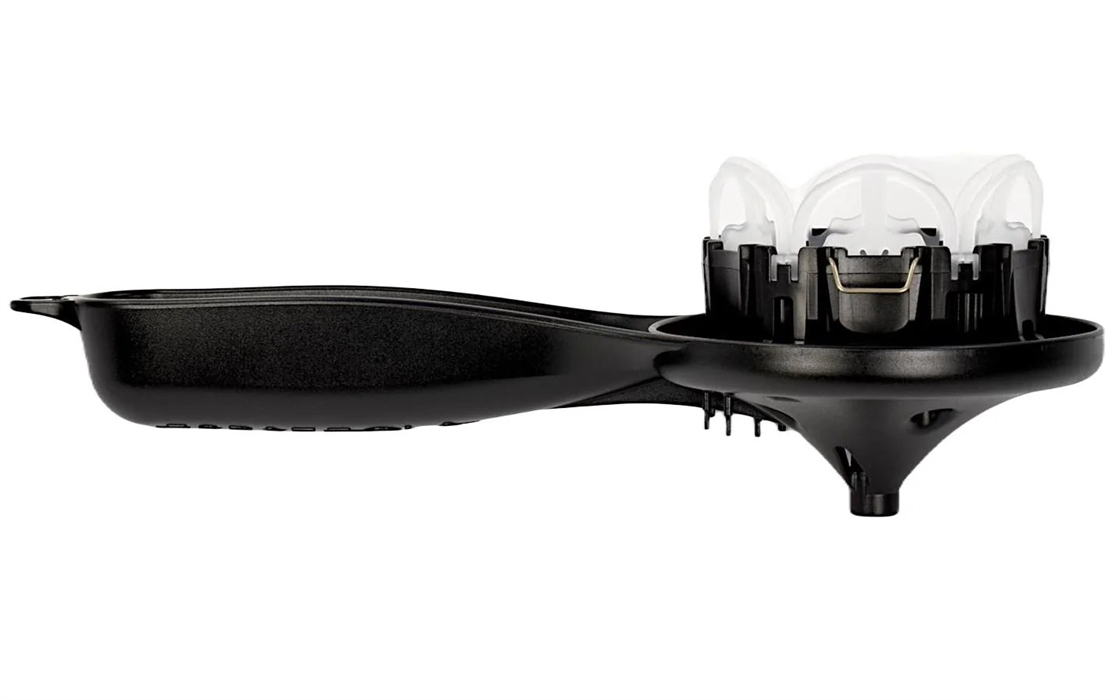 Gleichzeitig wird das Heisswasser der Espressomaschine genutzt, um die Brühgruppe gründlich durchzuspülen. Dabei wird es über den Becherrand sicher in die Tropfschale geleitet.