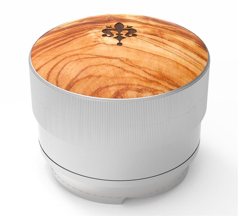 Die Basis aus rostfreiem Stahl wurde durch mechanische Präzisionsbearbeitung hergestellt, um erstklassige Ästhetik und Maßhaltigkeit sowie ein solides, langlebiges Produkt zu gewährleisten, zusammen mit dem raffinierten Design des oberen Griffs, erhältlich in schwarz eloxiertem Aluminium, Olivenholz, Walnussholz und natürlichem Eichenholz .