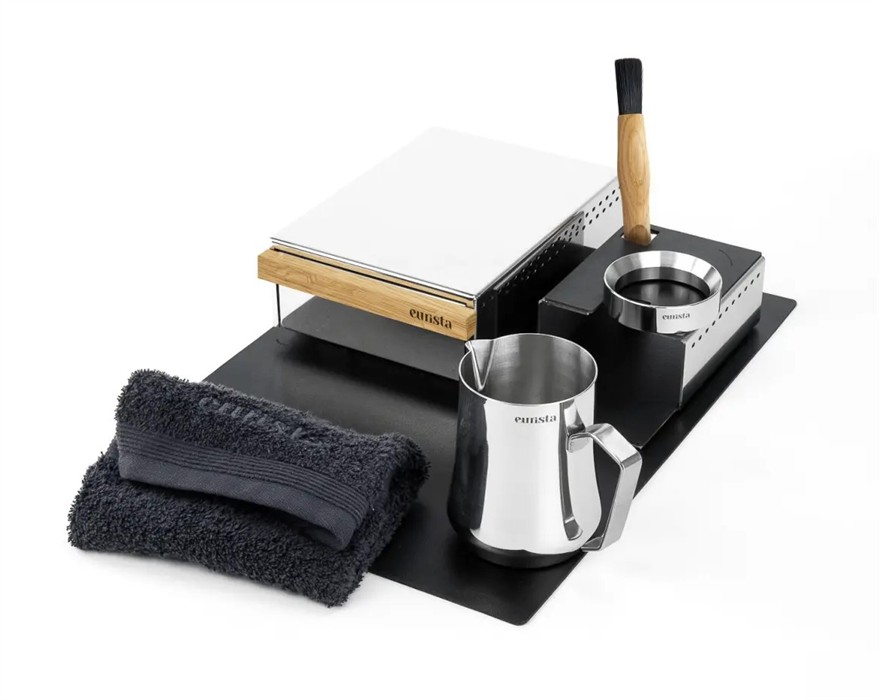 Eurista Grundmatte für die Kaffee-EckeFür eine aufgeräumte Kaffeeecke ist die Eurista Grundmatte ein Must-Have. Auf der Eurista Grundmatte findet abgestuft in drei Grössen alles seinen Platz. Von den Accessoires wie Ausklopfschublade und Tampingstation über Espressomaschine bis zur Mühle. Durch die verwendete hochwertige Lederalternative (vegan) ist die Eurista Grundmatte abwaschbar, pflegeleicht und gleichzeitig umweltfreundlich.